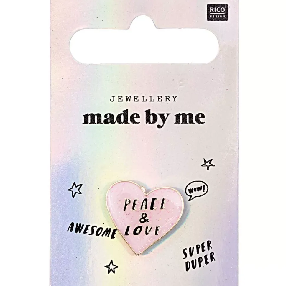 - Pequeño pin de un corazón rosa con purpurina con la frase peace & love.