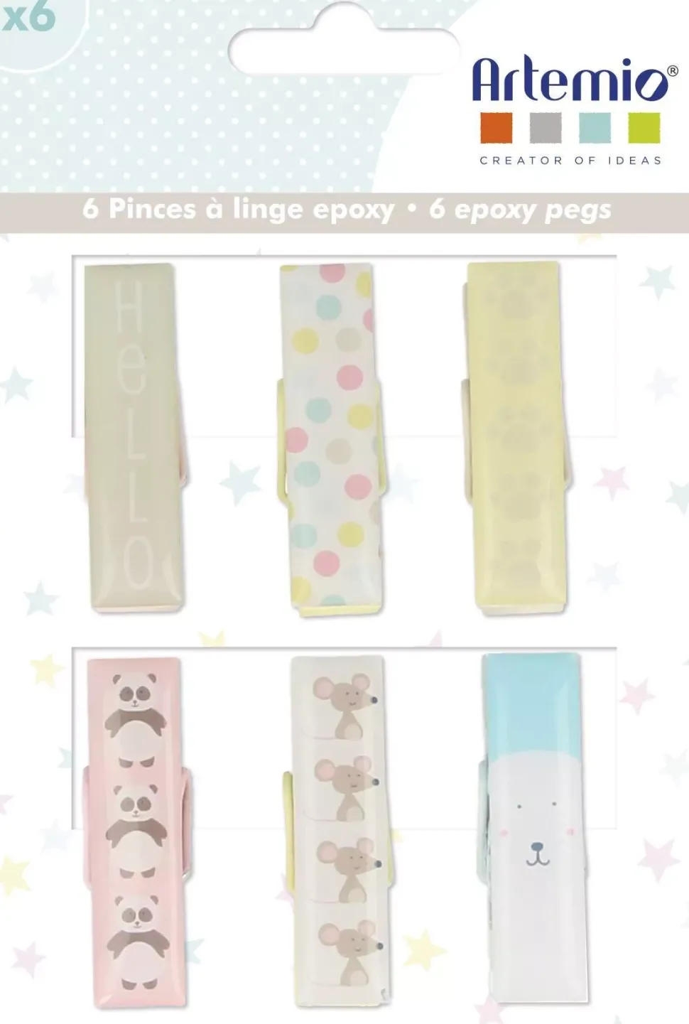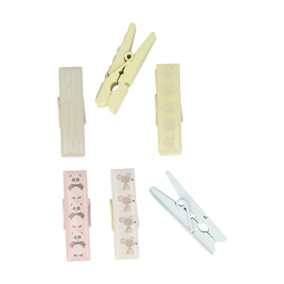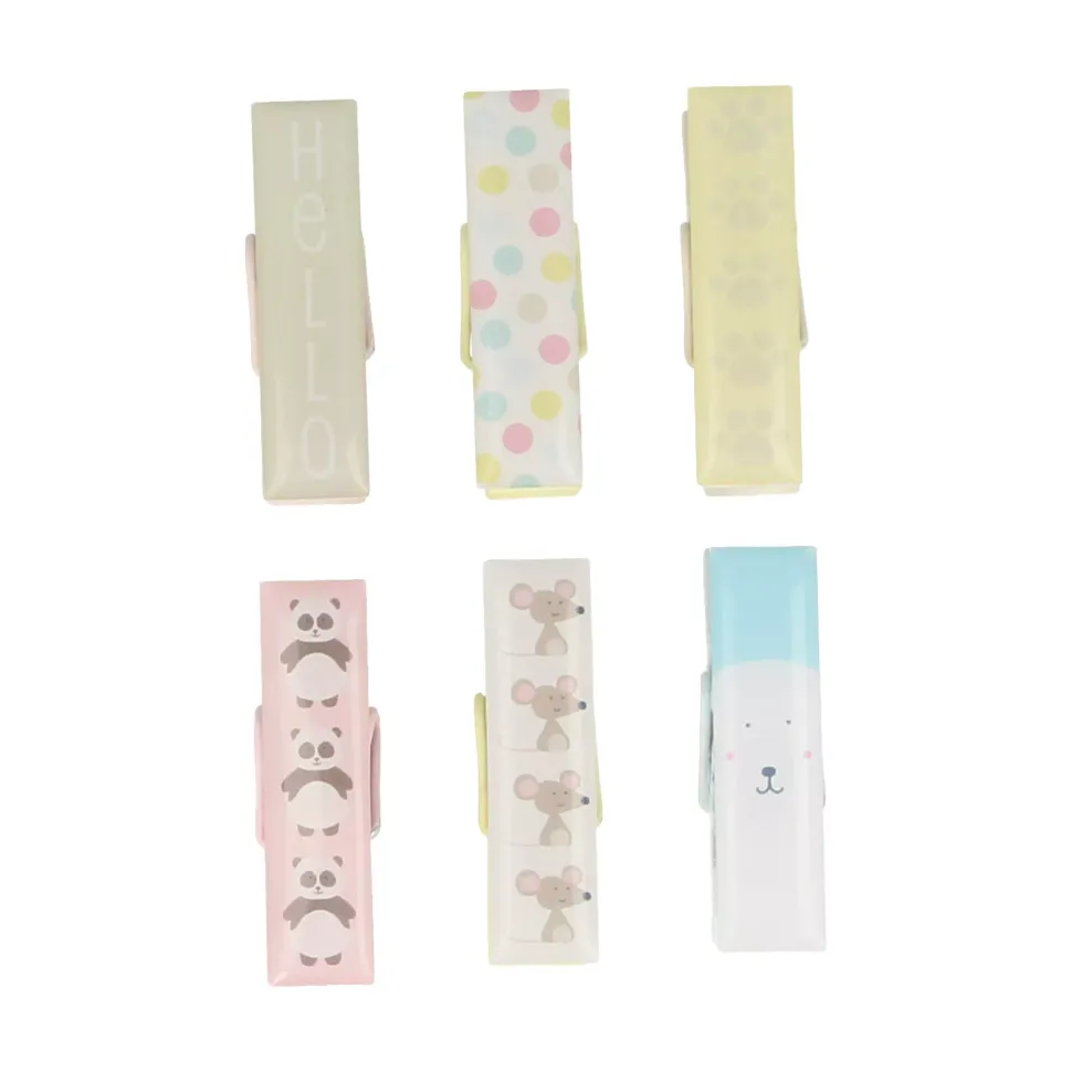 - Incluye 6 pinzas de con una cara en epoxy estampado en colores pastel con ratoncitos, oso pandas, lunares, huellitas, oso polar y hello.