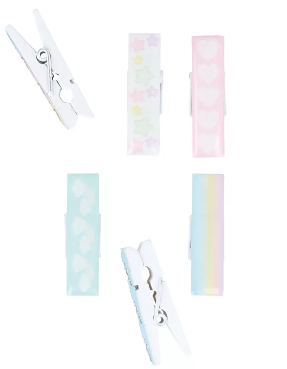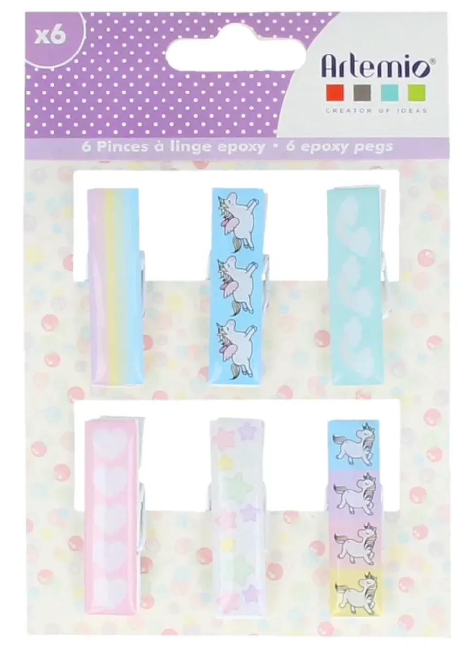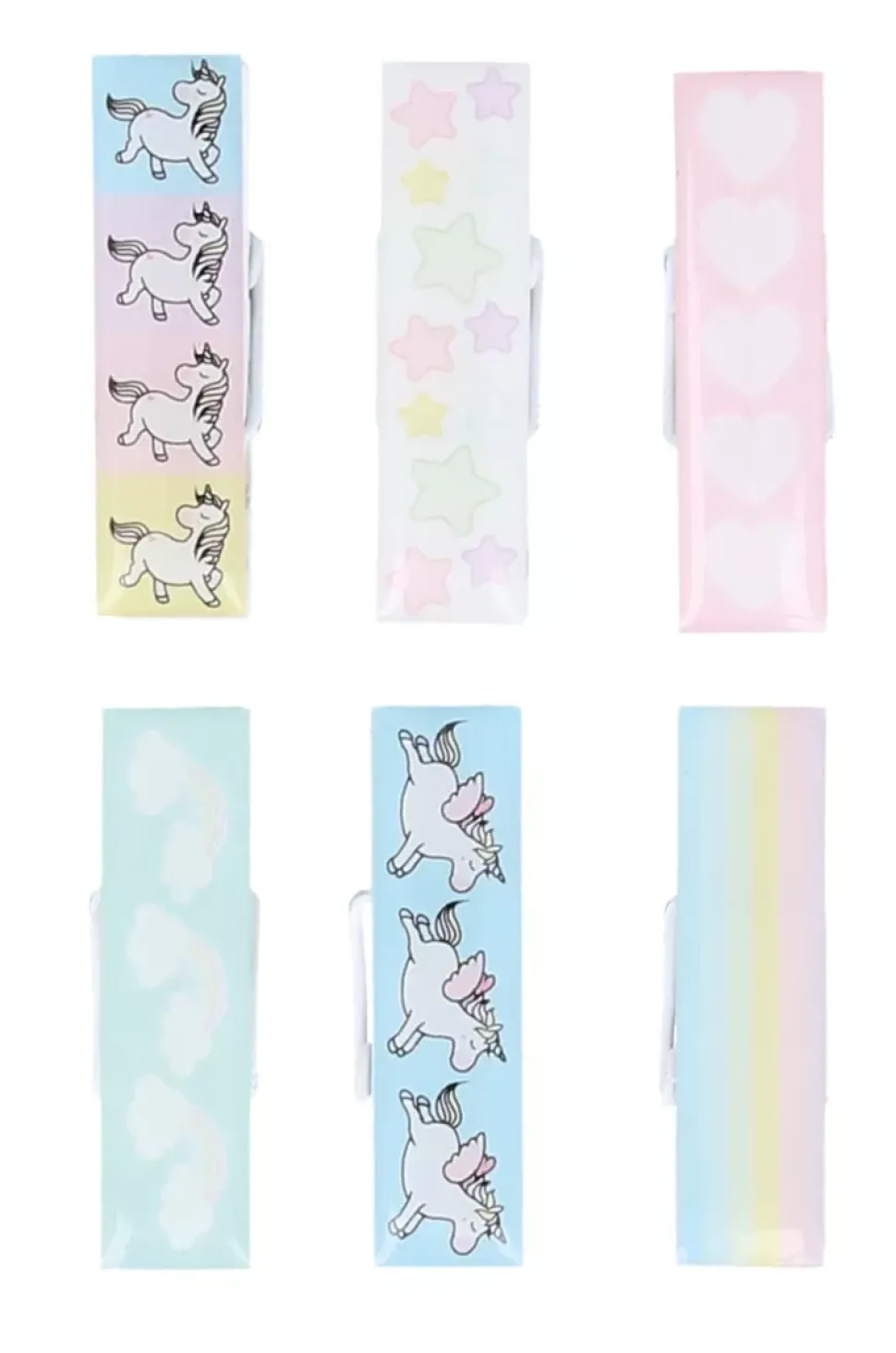 - Incluye 6 pinzas de con una cara en epoxy estampado en colores pastel de corazones, nubes, arco iris, estrellas y unicornios.