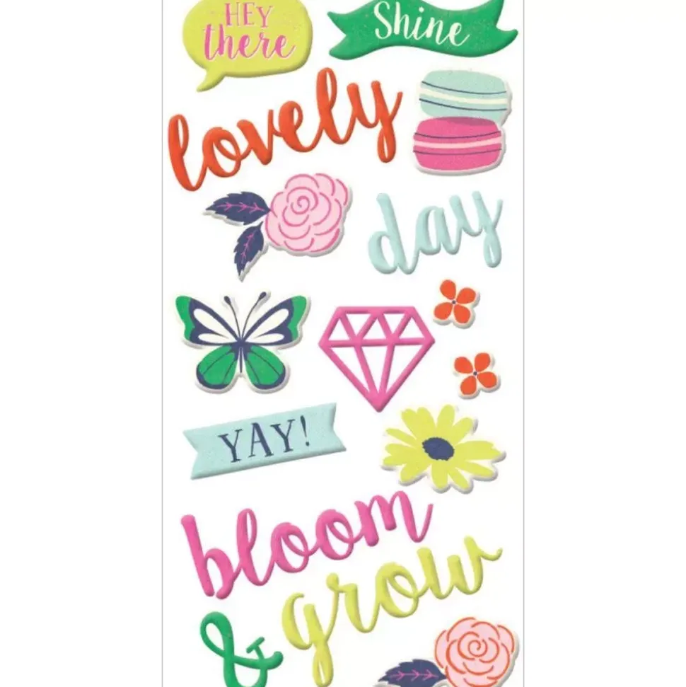 Las pegatinas contienen elementos como macarons, diamantes, mariposas, flores y frases y palabras como: hey there, shine, lovely, day, yay!, bloom, grow.