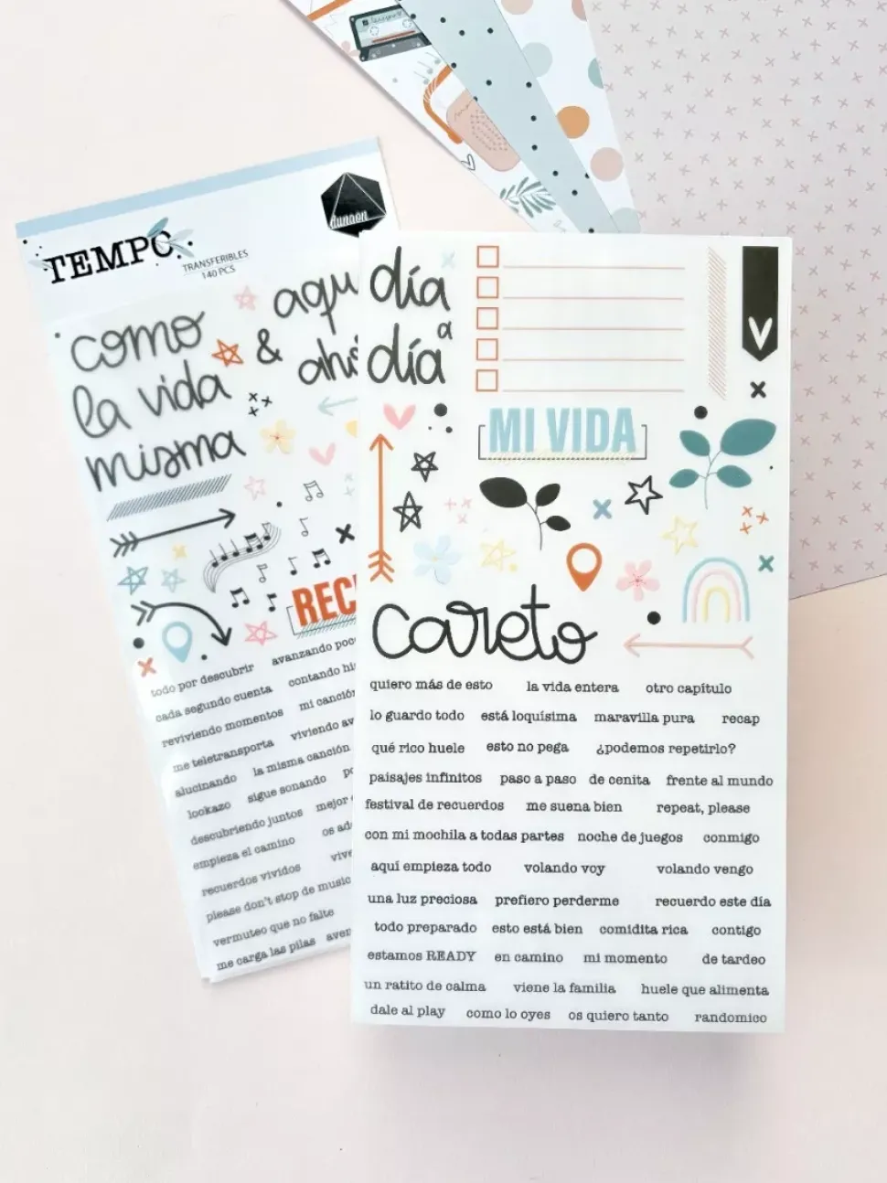 - Consiste en una lámina transparente con diseños adheridos que, gracias a la presión de una plegadora (incluido), herramienta rub-on o material similar, se transfieren y se quedan fijados a la superficie o proyecto.