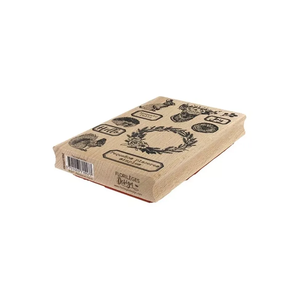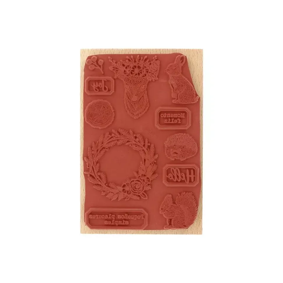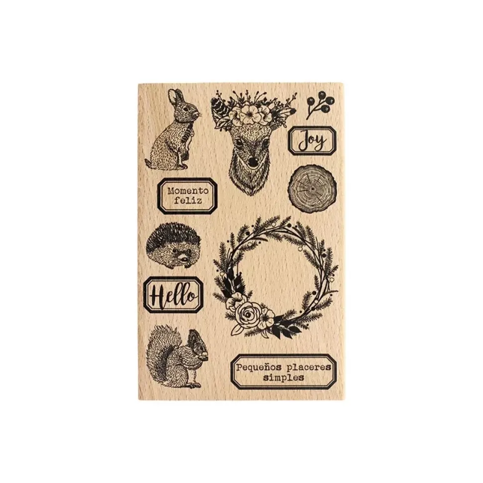 - Un sello con ilustraciones de erizo, ardilla, conejo, disco de madera, corona de ramas y flores, cabeza de ciervo con flores y etiquetas con frases en español: momento feliz, hello, pequeños placeres simples, joy.