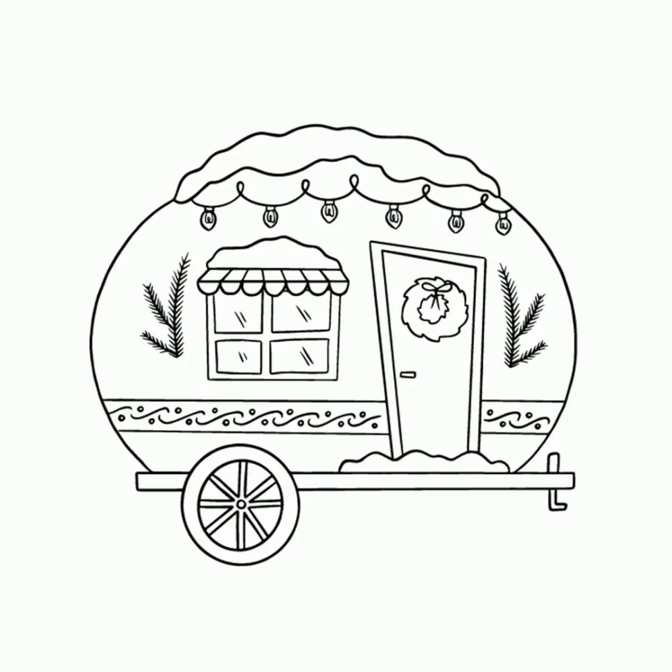 - Diseño de una caravana con nieve sobre su tejado y el alféizar de la ventana y con detalles navideños: una guirnalda de luces decora la caravana y una corona navideña reposa sobre la puerta.