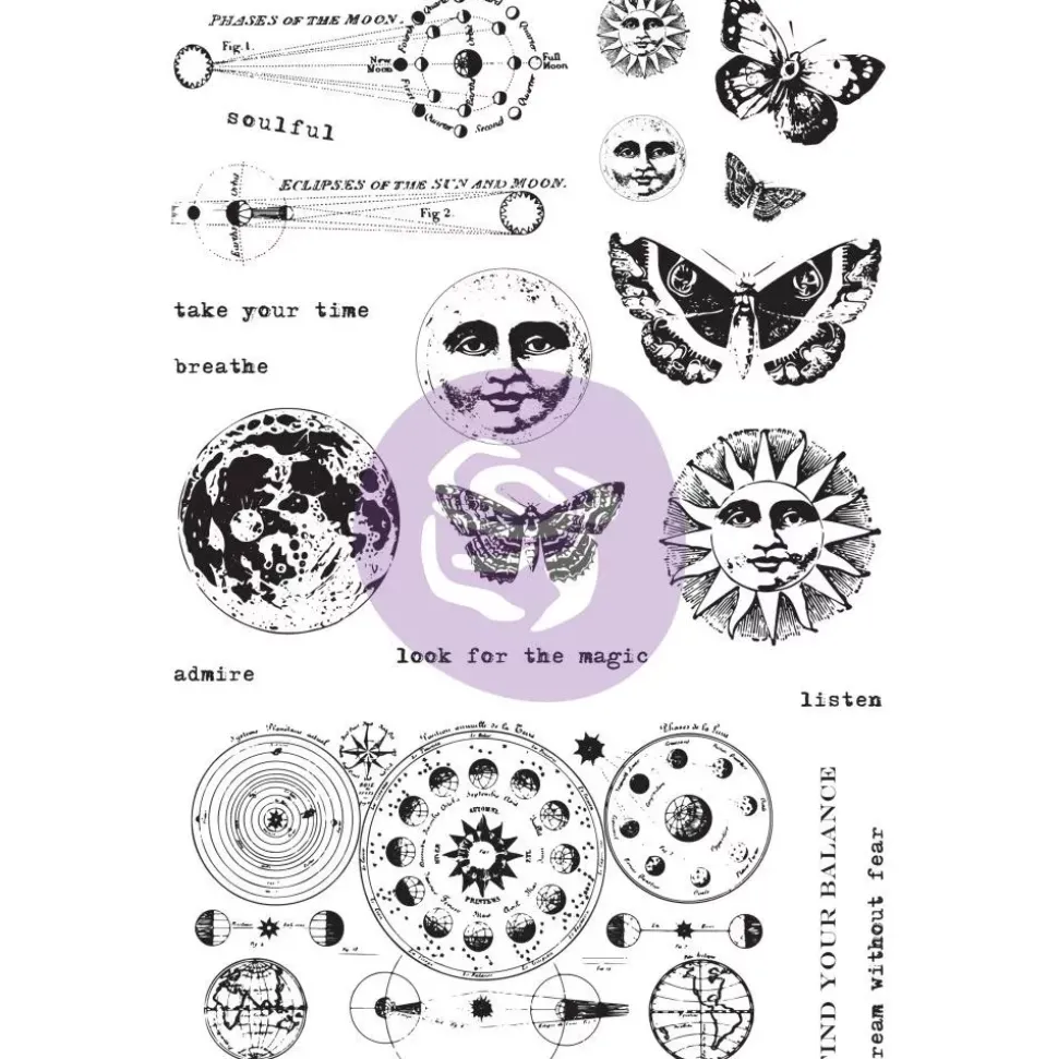 - Contiene 20 sellos de lunas con caras, mariposas, lunas, elementos astronómicos y texto en inglés.