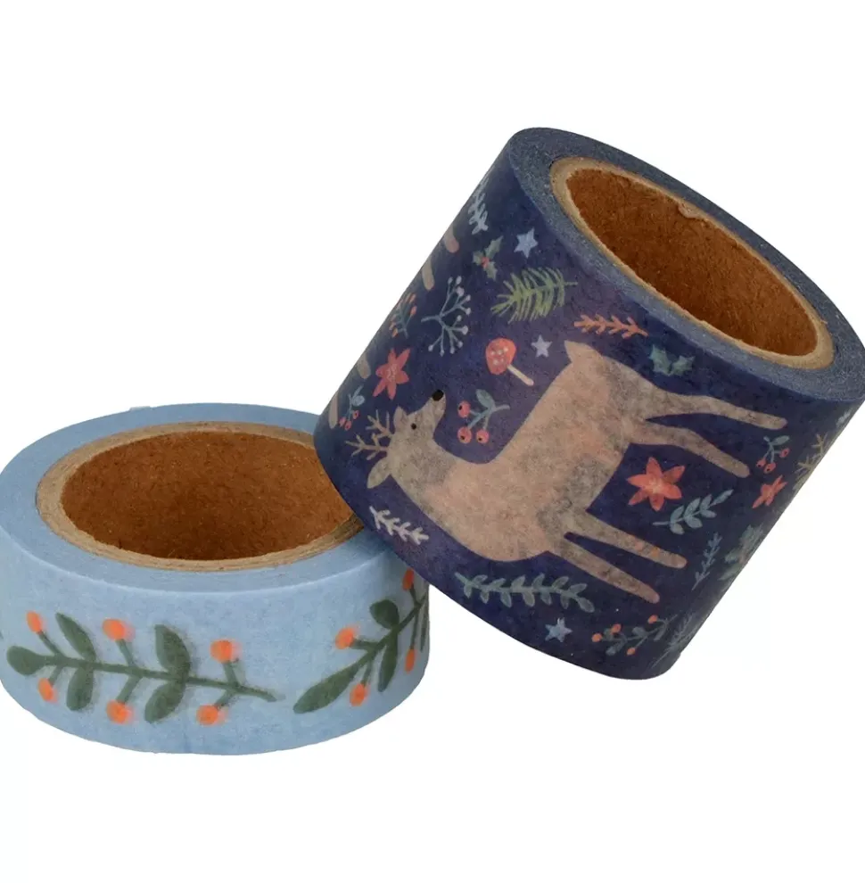 - Este set incluye 2 cintas adhesivas con ilustraciones de ciervos con motivos vegetales y de muérdago. En tonos azules.