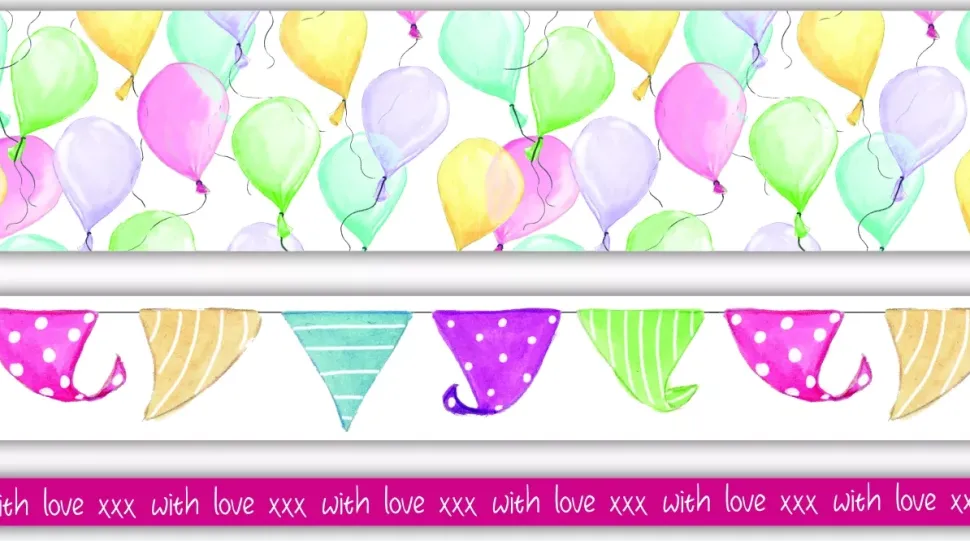 - Posee tres cintas que incluyen ilustraciones globos de colores, banderines y la frase en inglés «whith love xxx»