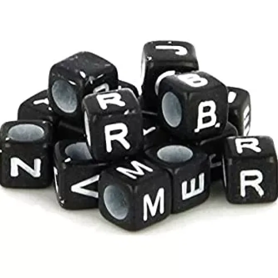 - Abalorios cuadrados en color negro. Cada abalorio cuenta con una letra inscrita.