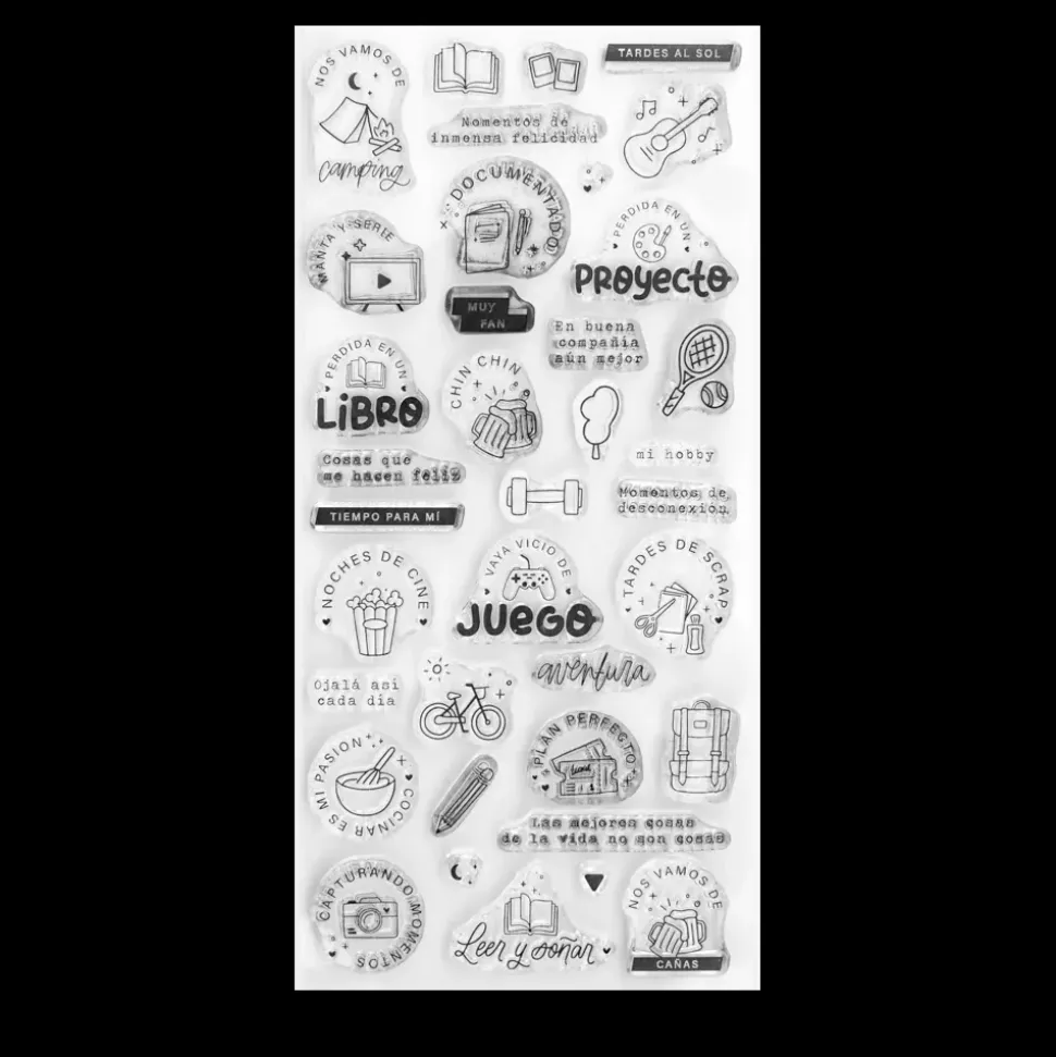 - Incluye sellos acrílicos con frases en castellano y diseños de temática de hobbies.