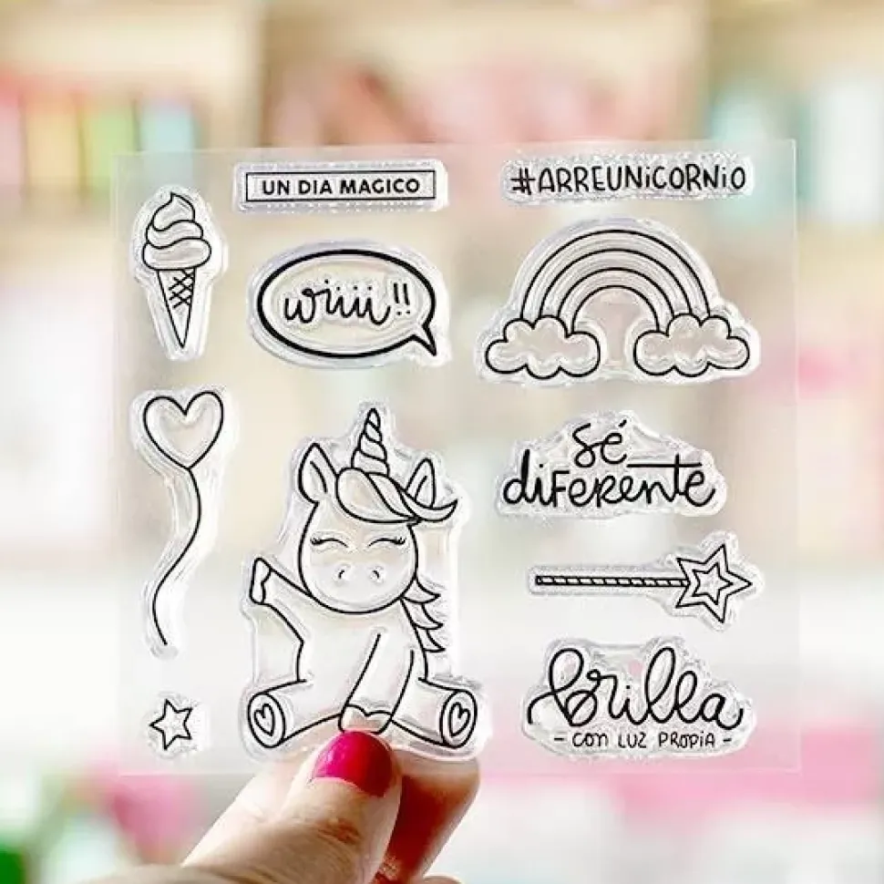 - Los unicornios son tan adorables que querrás estampar este sello en todos los sitios posibles. El Cono de helado, el globito y la varita son del tamaño perfecto para el bracito del uniconio ofreciendo más posibilidades.