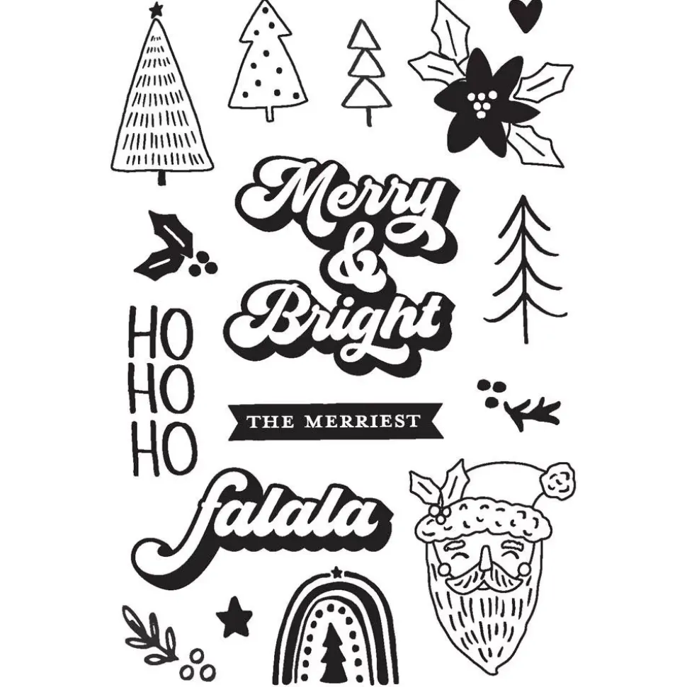 - Contiene 16 sellos con ilustraciones de pinos, flor de Pascua, cabeza de Santa, acebo y frases en inglés como Merry and bright, ho ho ho, the merriest, falala
