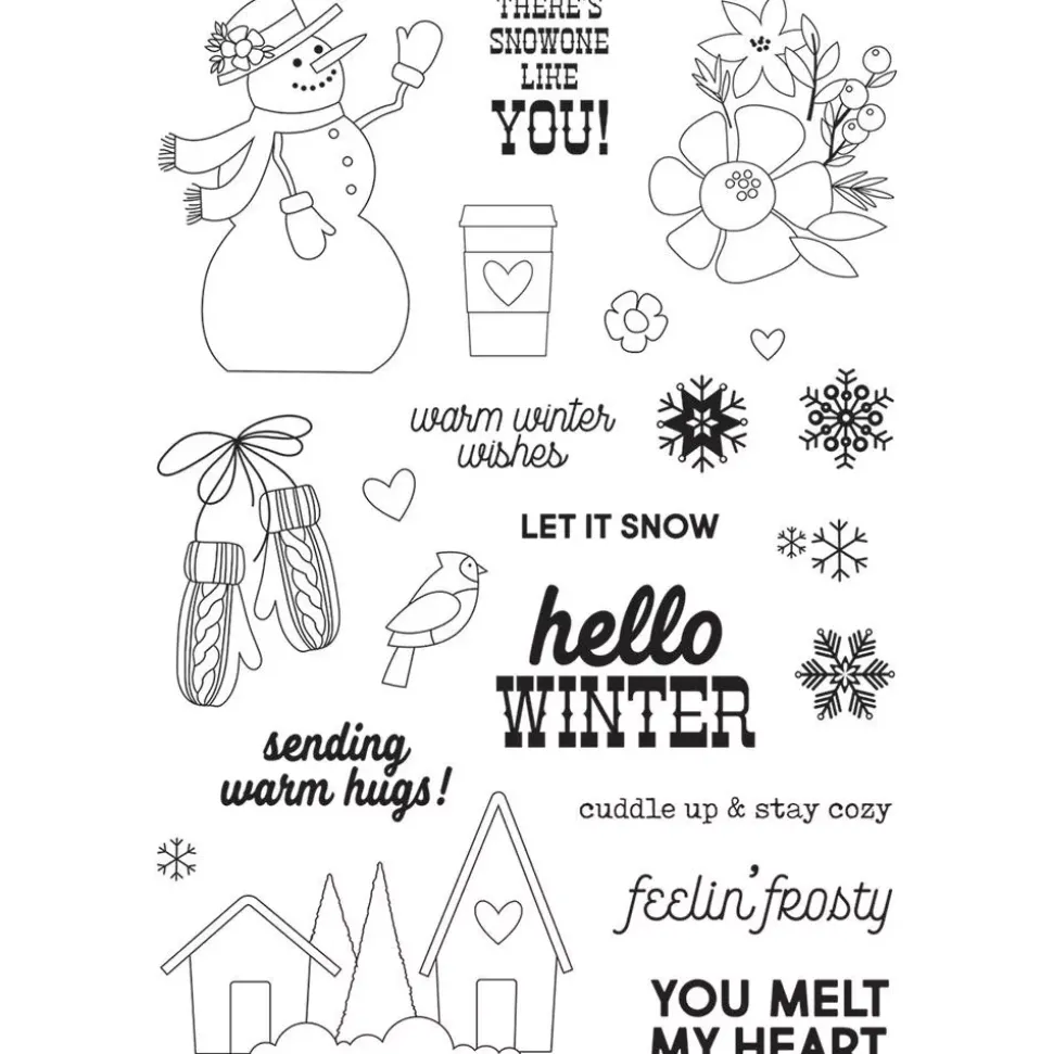 - Contiene 22 sellos con ilustraciones de copos de nieve, manoplas, petirrojos y frases como sending warm hugs, hello winter, you melt my heart, etc