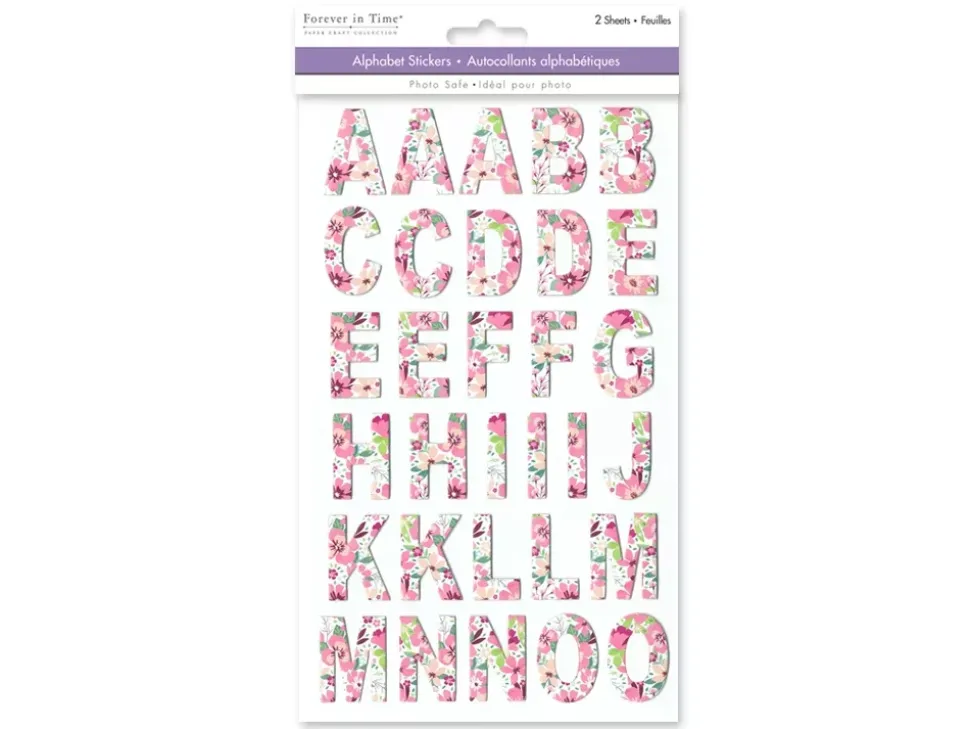- Pegatinas de las letras del abecedario con un estampado floral en rosa y verde.