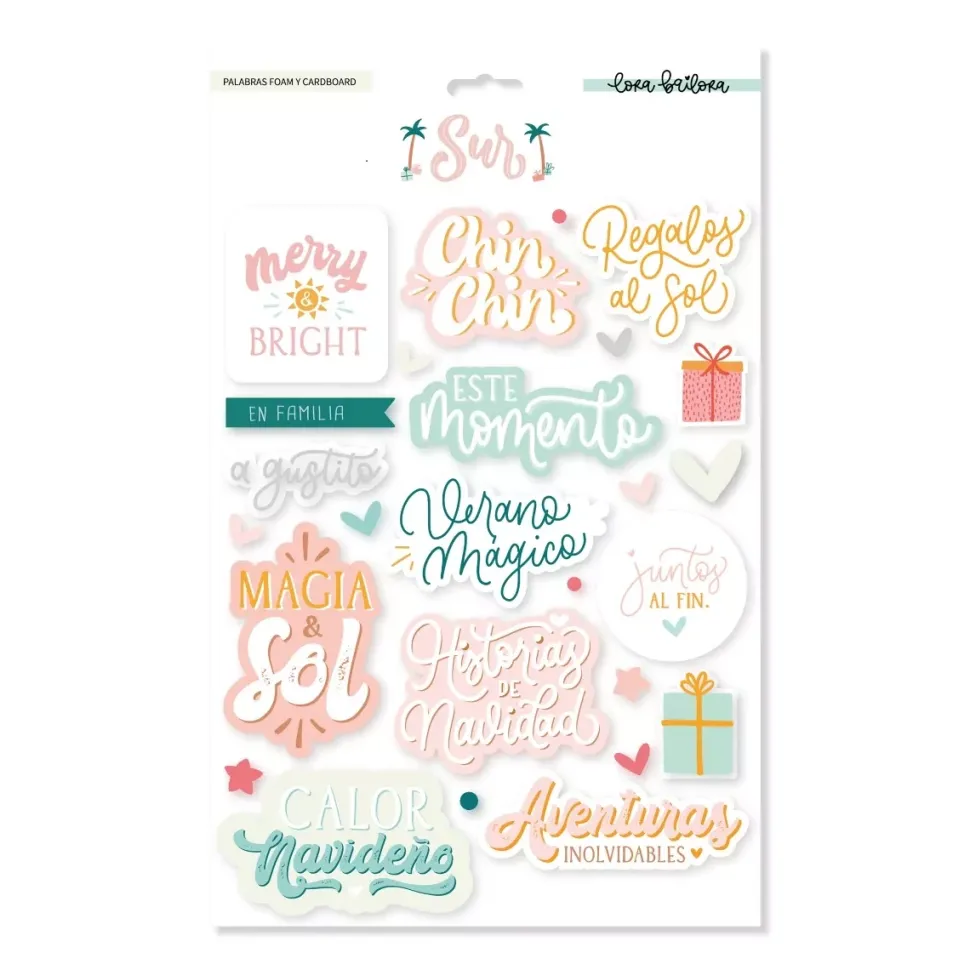 Incluye piezas en diferentes tamaños en español e inglés como: «merry and bright», «regalos al sol», «magia and sol», «historias de navidad», «juntos al fin» y ¡muchas más!