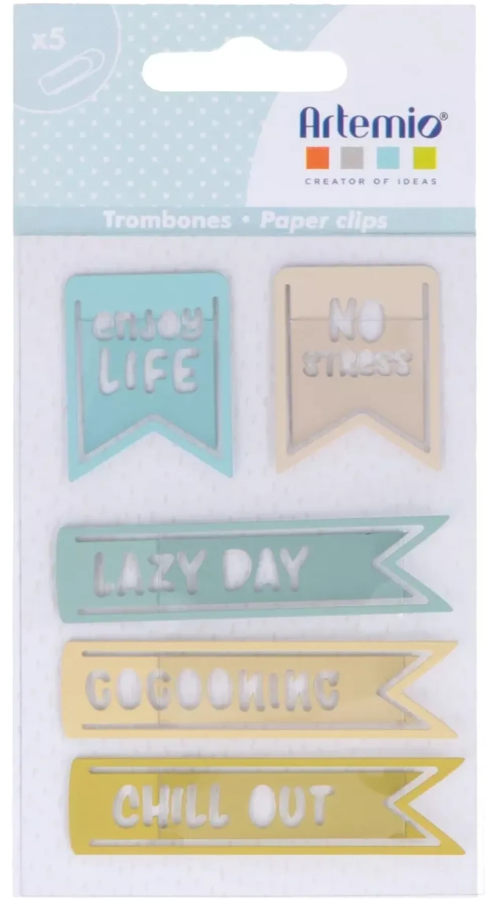 - Incluye 5 clips con forma rectangulares en forma de banner con dos picos y las frases enjoy life, no stress, lazy day, cocooning, chill out.