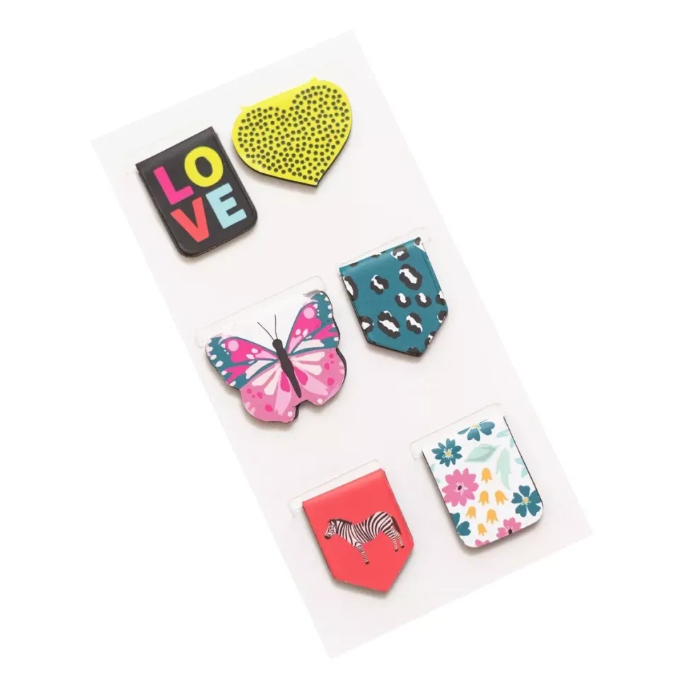 - Marcapáginas imantados con los bonitos diseños de la colección como mariposa, motivos florales, zebra, palabra «love» y corazón.