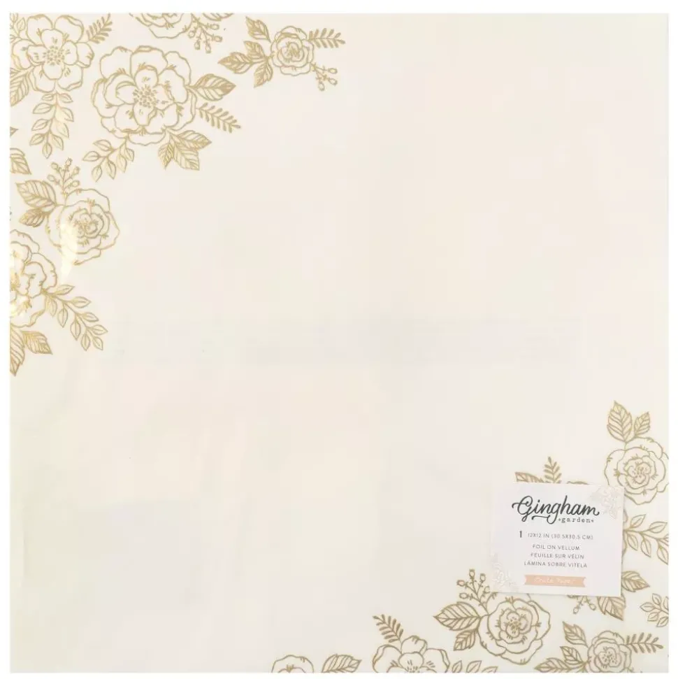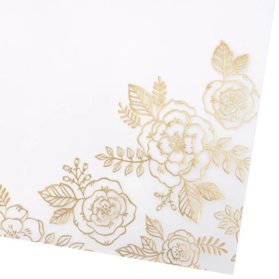 – Papel vellum con estampado de flores en foil dorado en dos de las esquinas.