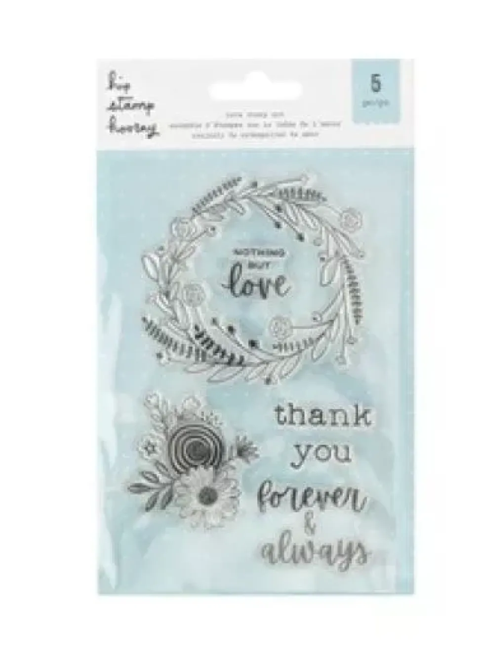 - Contiene 5 sellos con diseños florales y las frases en inglés «Nothing but love», «Thank you» y «Forever & always».