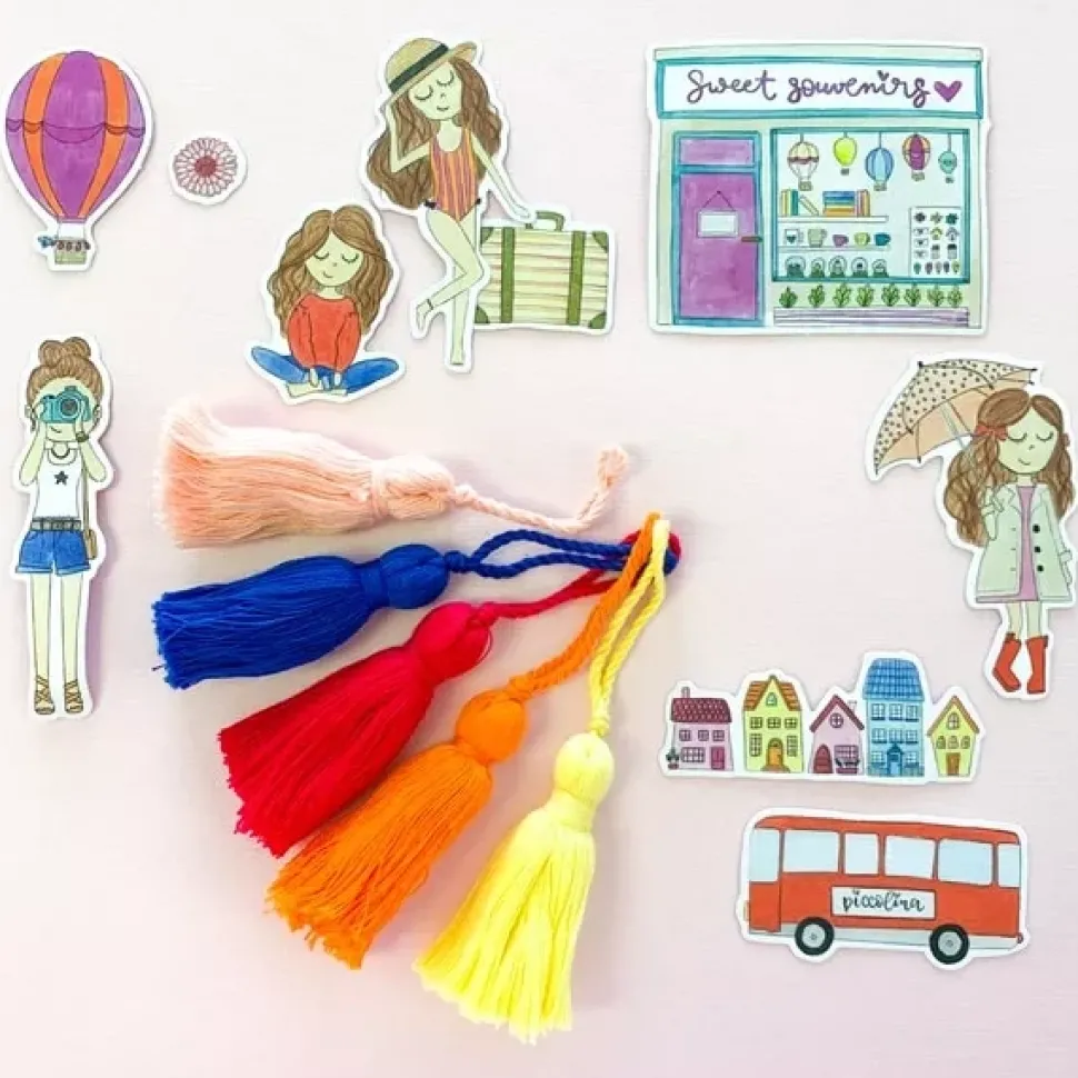 - Contiene 5 borlas de flecos en color amarillo, naranjam rojo, azul y rosa y blanco.