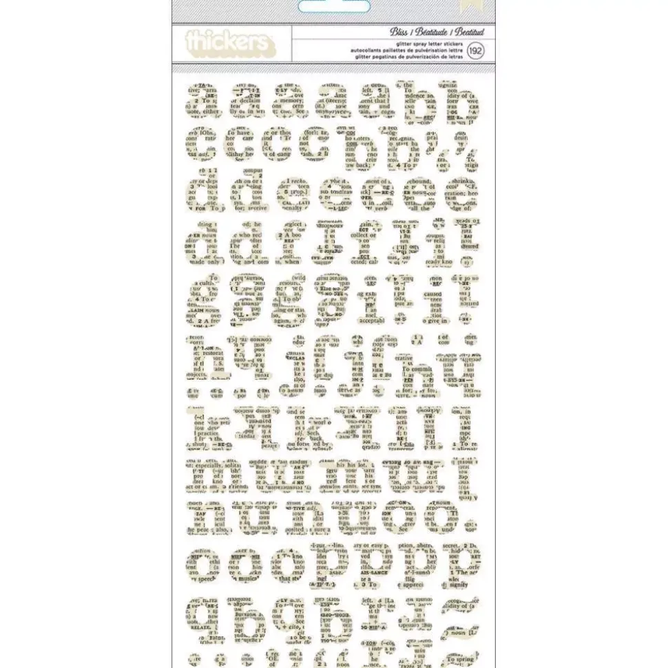 - Letras adhesivas en cartón (chipboard) con estampado de periódico y glitter transparente por encima..