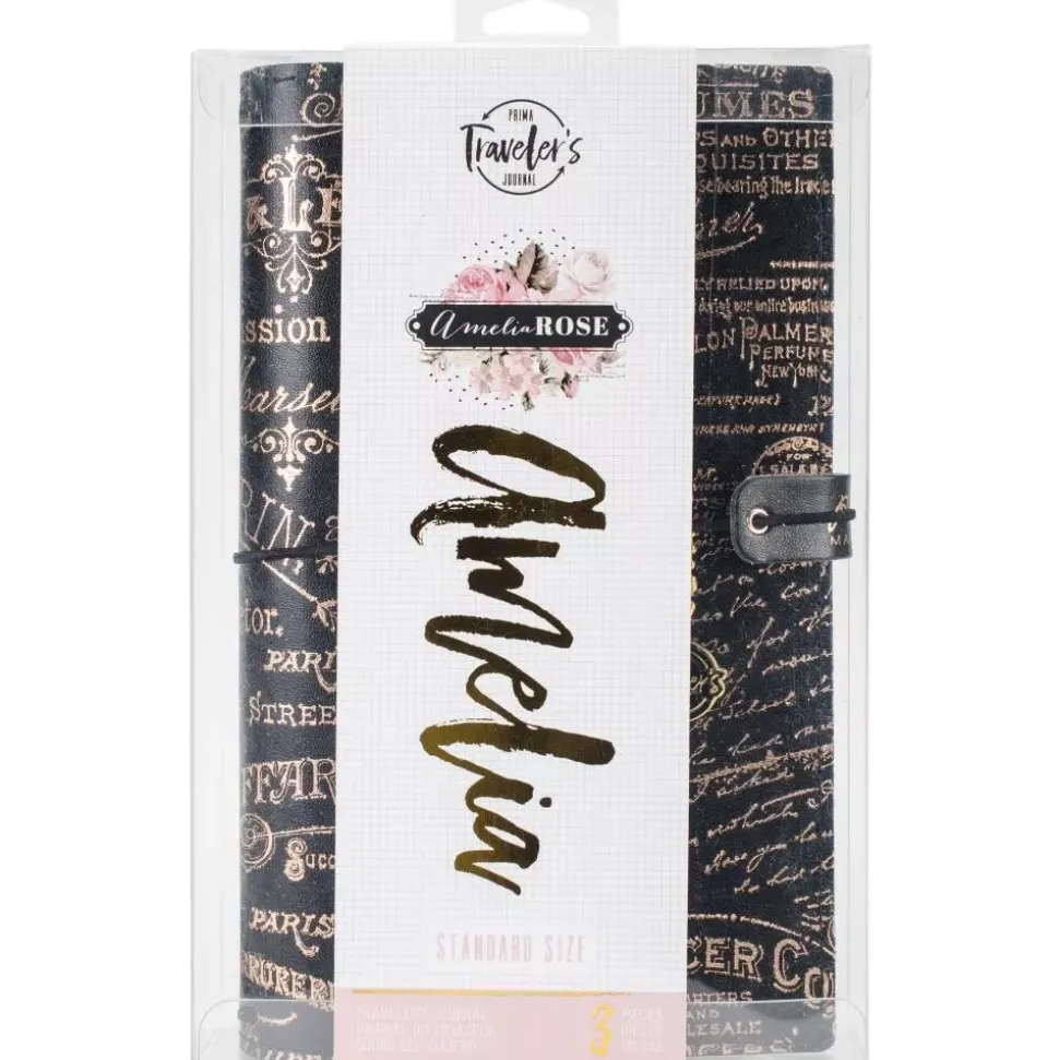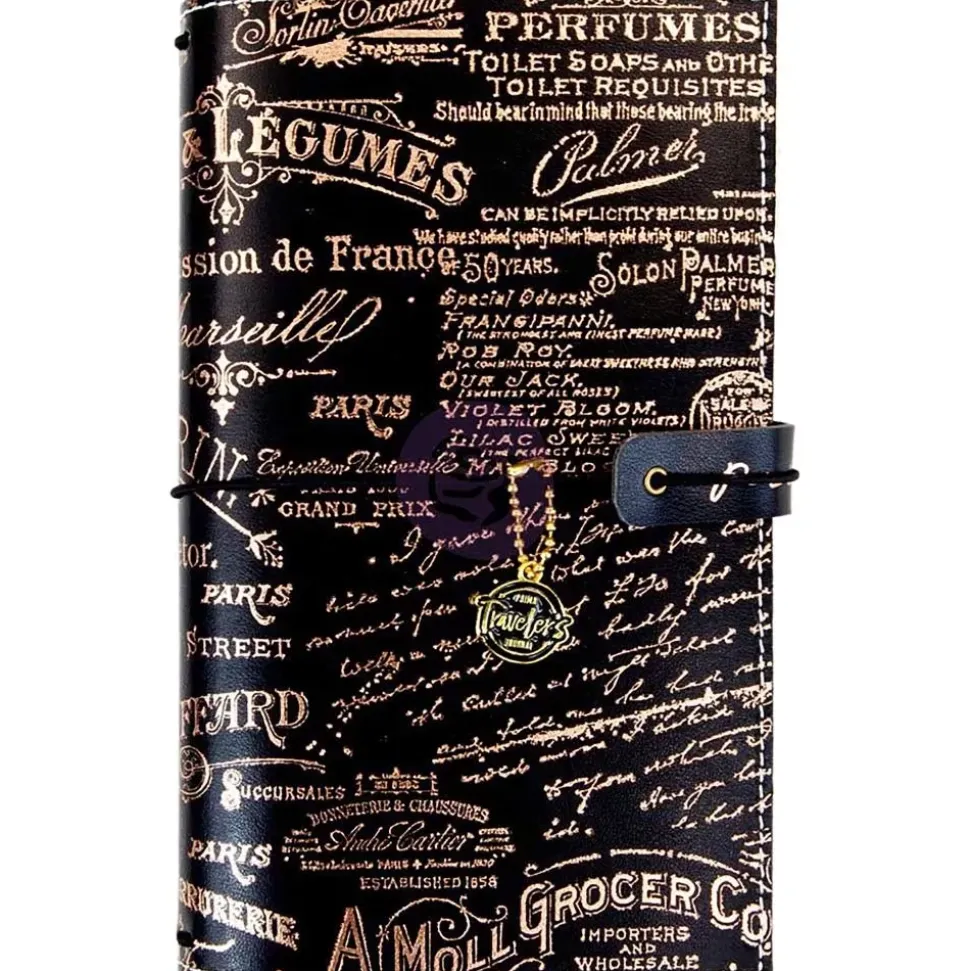 Exteriormente tiene una tapa de falso cuero cosido con múltiples bolsillos en su solapa interior para guardar y colocar sticker, post-it, etc. Es de color negro con textos vintage en color dorado. En la zona central contiene cuatro gomas elásticas que te permitirán extraer el cuaderno, cambiarlo por cualquier otro o añadirle nuevos midoris y así guardar hasta 4 midoris. El cierre exterior se consigue gracias a una goma que mantiene tu travel notebook cerrado con todo su interior bien sujeto. En la goma encontrarás un pequeño charm dorado.