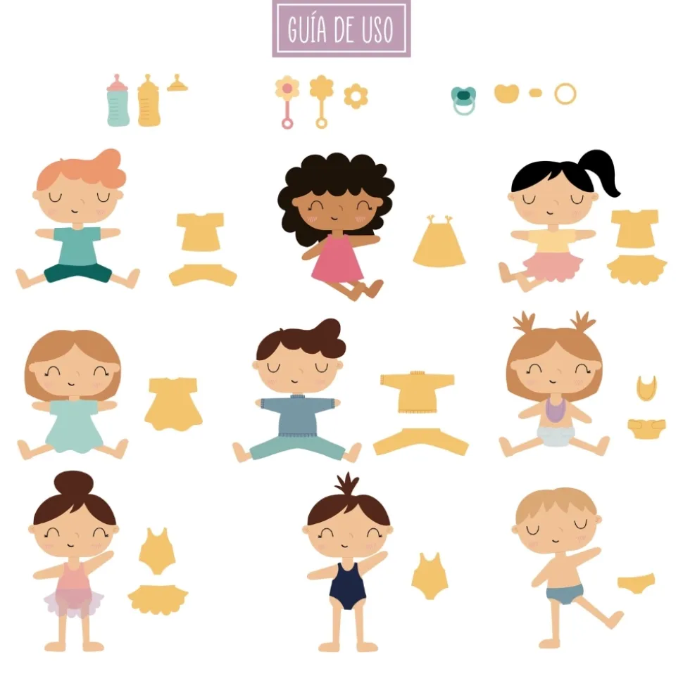 - Troquel para realizar diseños del cuerpo de niño y niña en tamaño mini. Además, incluye pelucas y ropa.