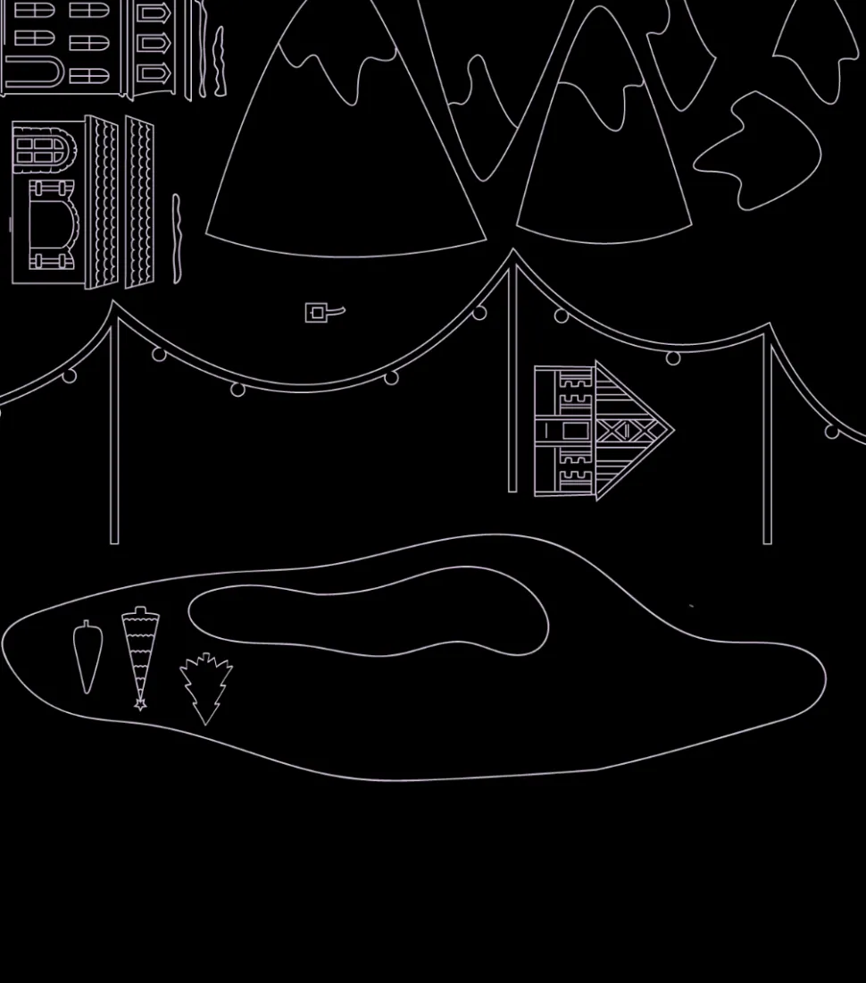 - Podrás realizar el diseño de una escena navideña de un pueblo frente un lago con montañas al fondo.