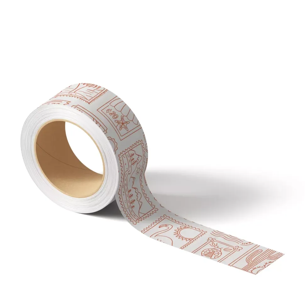 - Esta cinta incluye ilustraciones de sellos postales con motivos veraniegos sobre un fondo blanco.